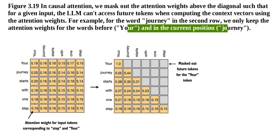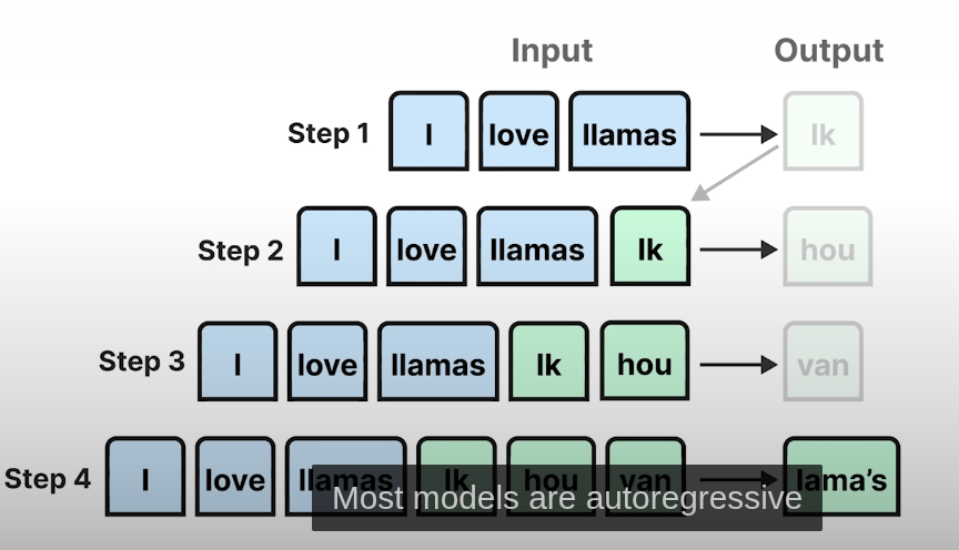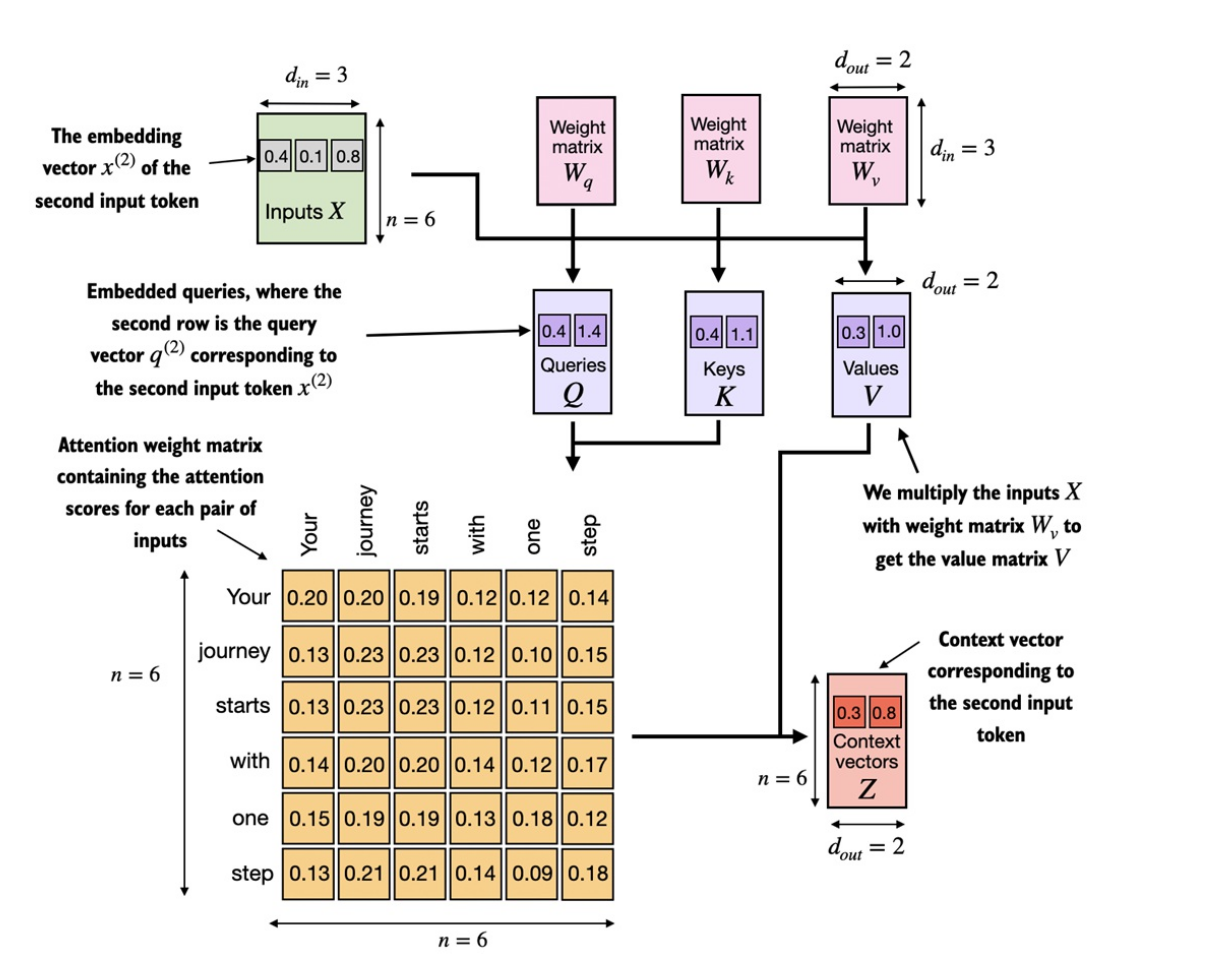 - Each token’s query (Q) is compared against the keys (K) of all previous tokens.