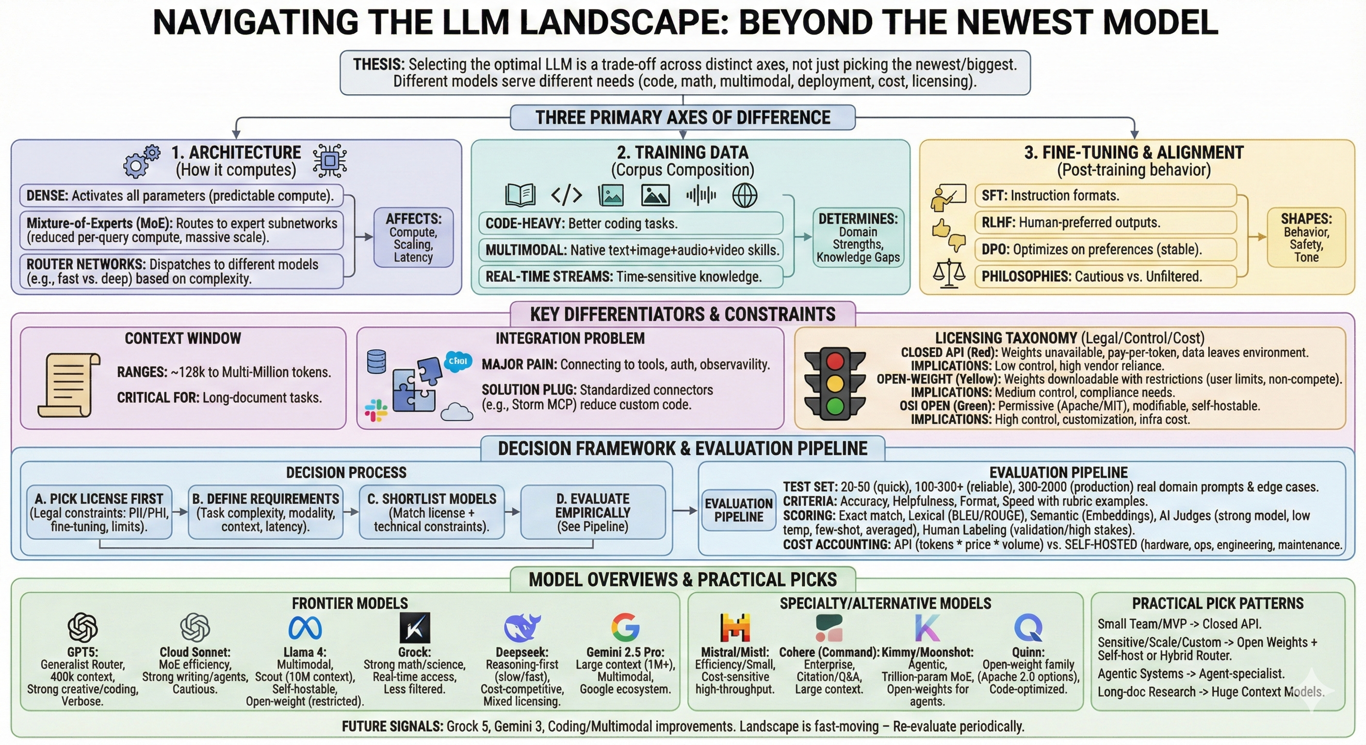 - Picking the newest/biggest LLM is not always optimal. Different models have distinct tradeoffs (code, math, multimodal, deployability, cost, licensing).