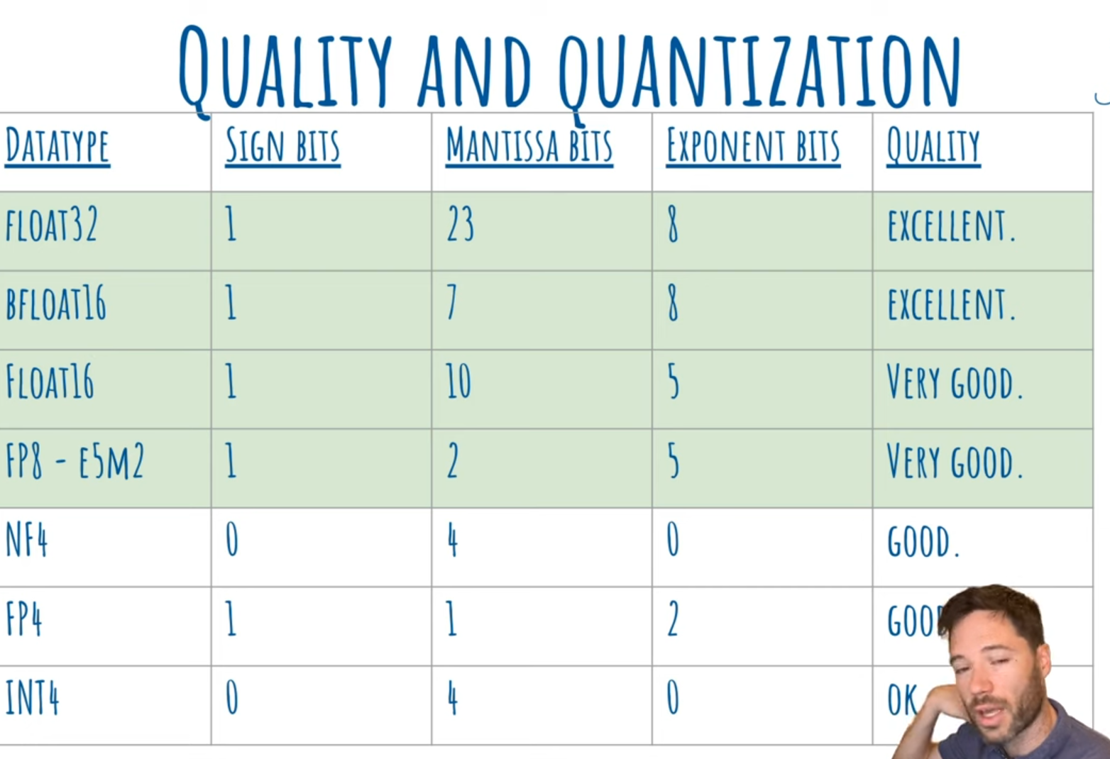 | NF4 (Normal Float 4) | 0 | 4 | 0 | None (fixed scale) | Good | Quantized inference | Good |