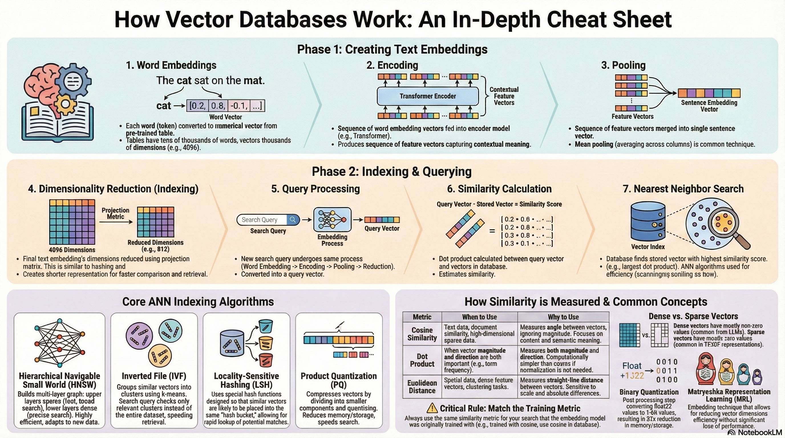 Note: The fundamental principle for choosing similarity metrics is to match the metric used during embedding model training. For instance, if an embedding model like all-MiniLM-L6-v2 was trained using cosine similarity, using the same metric for indexing will produce optimal results. This alignment ensures consistency between the model’s learned representations and the database’s similarity calculations.