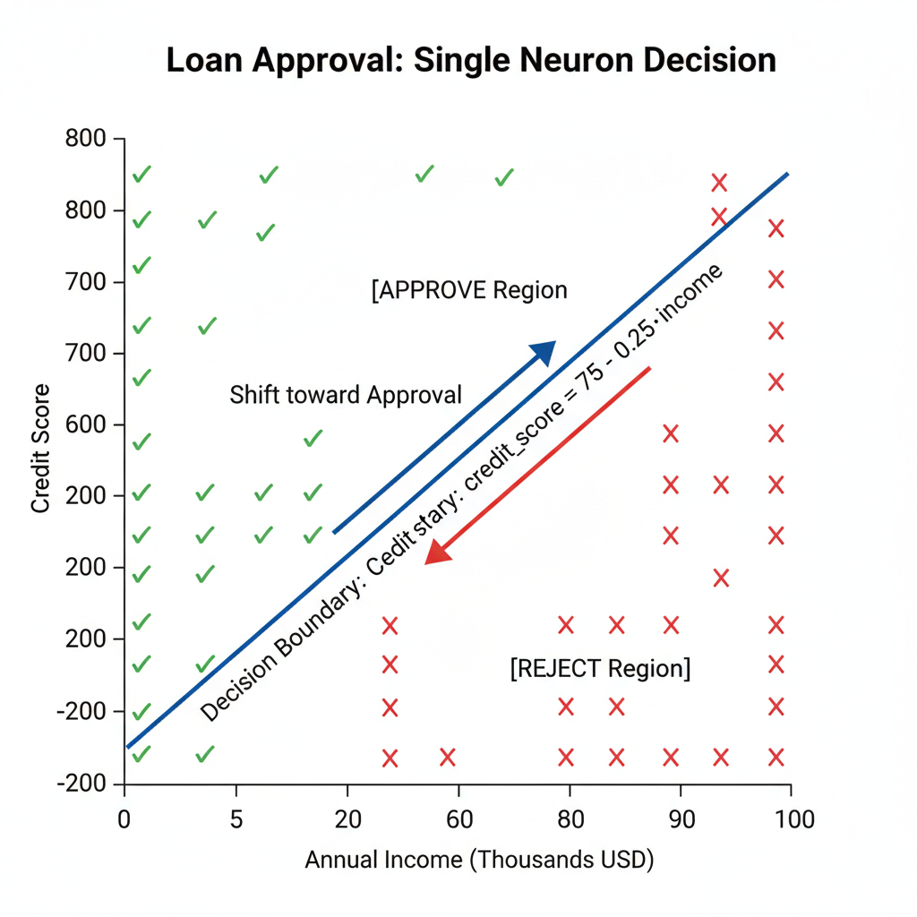 - w₂ = 2.0: For every 1-point increase in credit score, the decision shifts by 2 units toward approval (4× more important than income!)