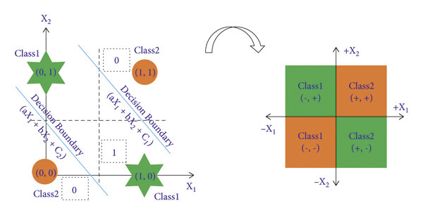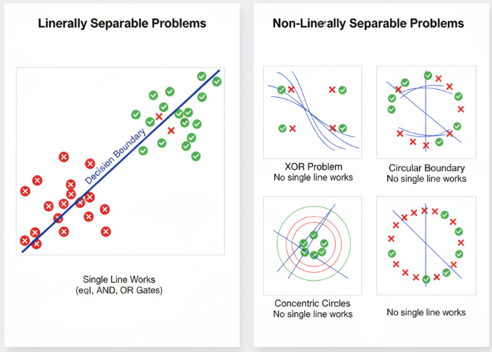 XOR is the classic example: you need (0,1) and (1,0) to be class 1, but (0,0) and (1,1) to be class 0. No single line can achieve this separation.